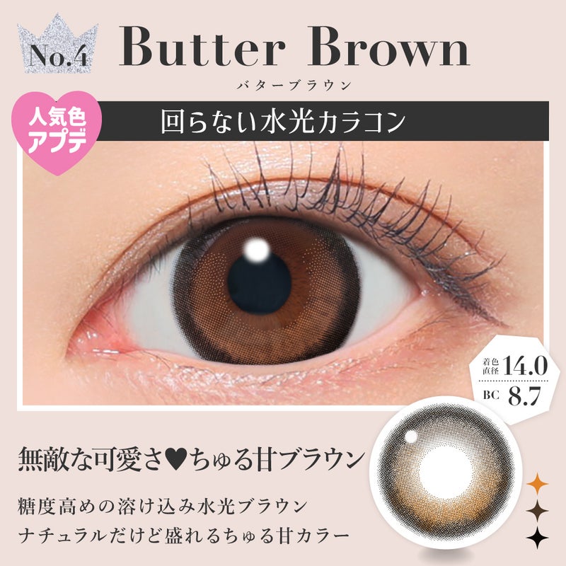 - 「回らない水光カラコン」はButter Brown、Pulmo Grayの2色です。