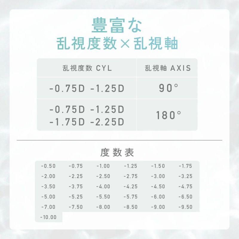 -6.50~-10.00(0.50単位)乱視度数(CYL) -0.75D/-1.25D/-1.75D/-2.25D 乱視軸(AX/AXIS) 90°/180° DIA(直径) 14.5mm BC(ベースカーブ) 8.7mm 含水率 58% 数量 1箱30枚入り 製造販売元 Pegavision Japan 区分 高度管理医療機器 製造国 台湾製 販売元・広告文責 株式会社Lcode