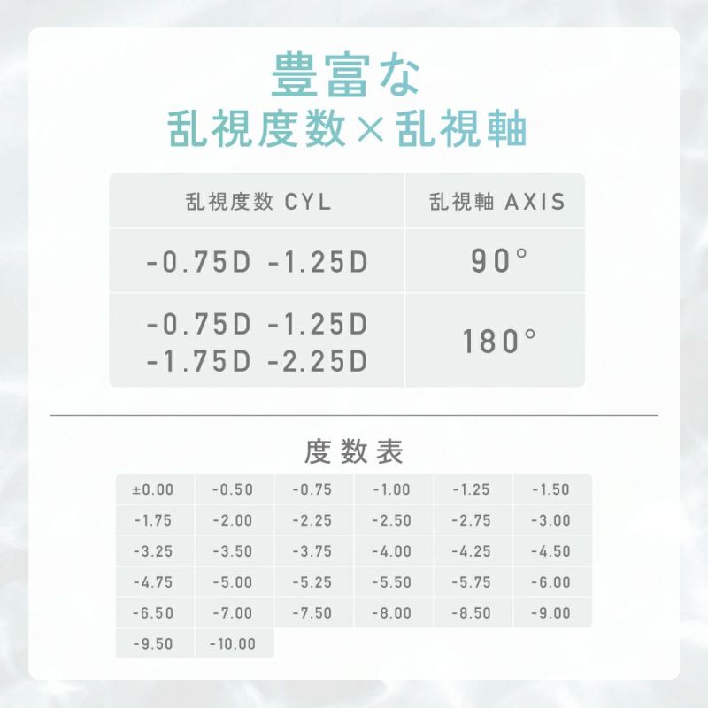 -6.50~-10.00(0.50単位)乱視度数(CYL) -0.75D/-1.25D/-1.75D/-2.25D 乱視軸(AX/AXIS) 90°/180° DIA(直径) 14.5mm BC(ベースカーブ) 8.7mm 含水率 58% その他 UVカット/モイスチャー 数量 1箱30枚入り 製造販売元 Pegavision Japan 区分 高度管理医療機器 製造国 台湾製 販売元・広告文責 株式会社Lcode
