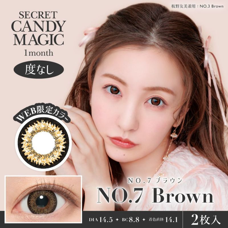 商品名 シークレットマンスリー 使用期限 開封後1ヶ月 カラー NO.7ブラウン(ブラウン) 販売度数 ±0.00(度なし) DIA(直径) 14.5mm 着色直径 14.1mm BC(ベースカーブ) 8.8mm 含水率 38.0% 鋳型製法 キャストモールド製法 数量 1箱2枚入り 選任製造販売元 株式会社El Dorado 区分 高度管理医療機器 製造国 韓国製 販売元・広告文責 株式会社Lcode