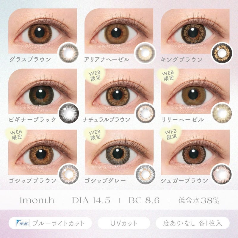 -5.50~-8.00(0.50単位)DIA(直径) 14.5mm 着色直径 13.9mm BC(ベースカーブ) 8.6mm 含水率 38.0%(低含水)