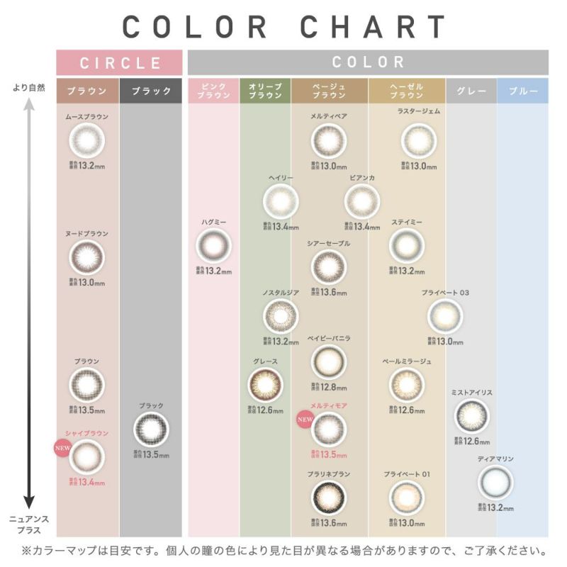 ReVIA 1day(レヴィア ワンデー)&1month(マンスリー) カラー比較表