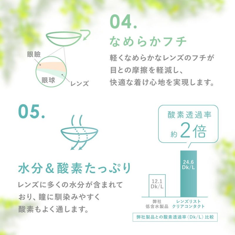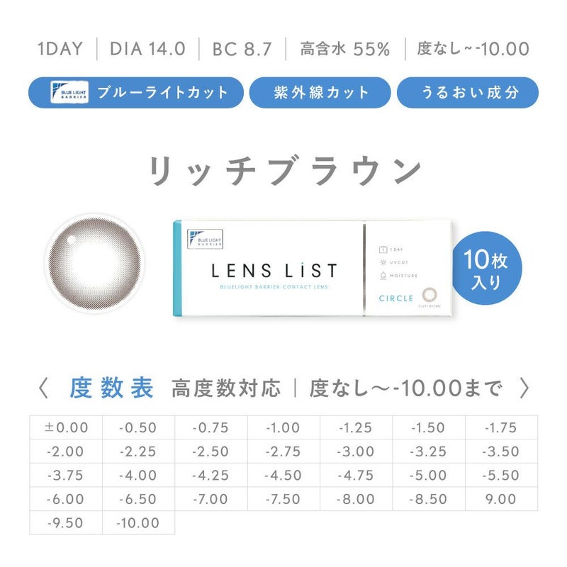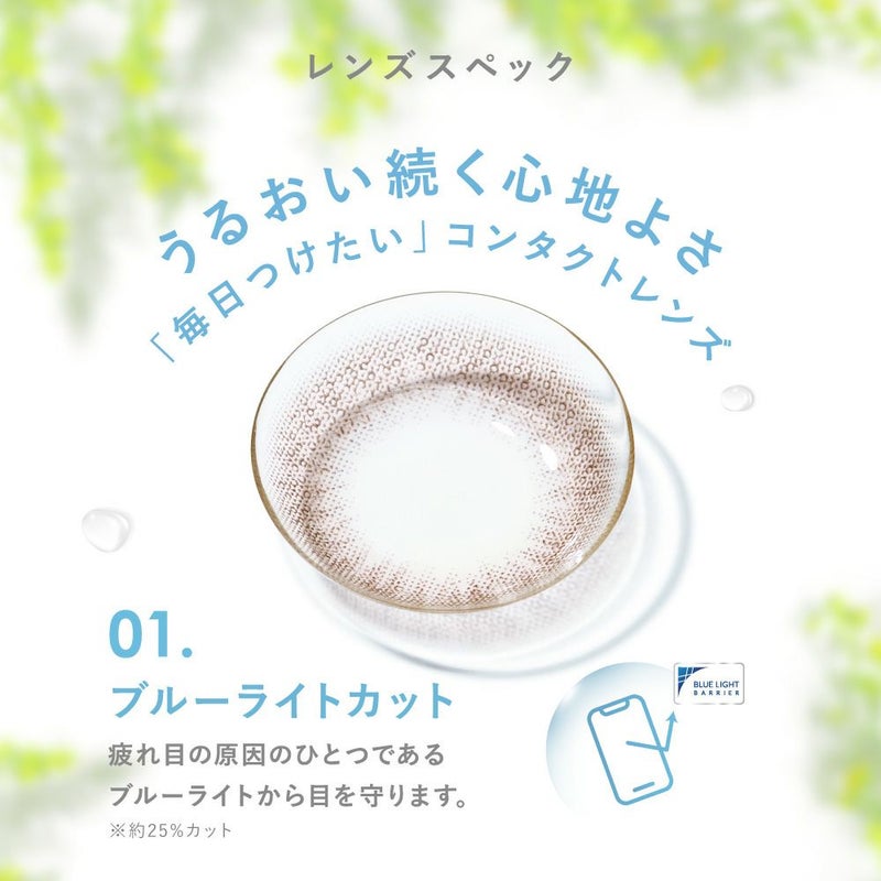 -5.50~-10.00(0.50単位)DIA(直径) 14.0mm 着色直径 13.0mm BC(ベースカーブ) 8.7mm 含水率 55% レンズ製法 キャストモールド製法 その他 ブルーライトカット(約25%)