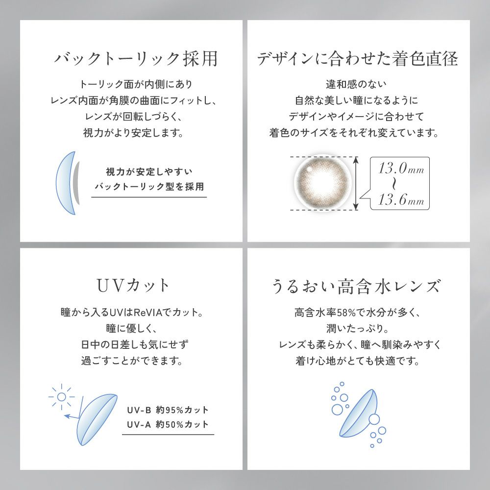 -5.50~-10.00(0.50単位)DIA(直径) 14.5mm 着色直径 13.6mm BC(ベースカーブ) 8.7mm 含水率 58% その他 UVカット/モイスチャー レンズ製法 キャストモールド製法 数量 1箱10枚入り 製造販売元 Pegavision Japan株式会社 区分 高度管理医療機器 製造国 台湾製 販売元 株式会社Lcode