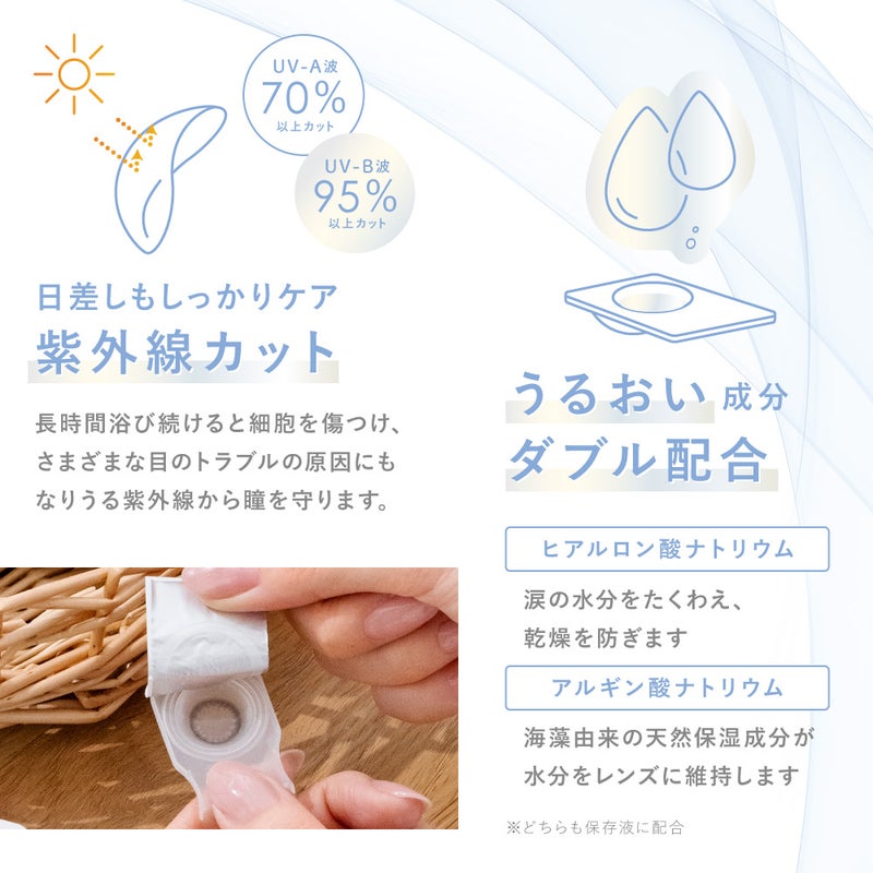 -5.50~-10.00(0.50単位)DIA(直径) 14.0mm 着色直径 13.5mm BC(ベースカーブ) 8.7mm 含水率 47% レンズ製法 キャストモールド製法 その他 UVカット/モイスチャー