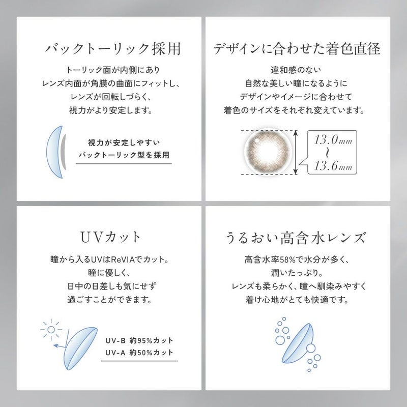 商品名 レヴィアトーリックワンデー 販売名 レヴィア アクアモイスト 使用期限 開封後1日 カラー Sheer Sable - シアーセーブル フチ あり 乱視度数(CYL) -0.75D/-1.25D/-1.75D/-2.25D 乱視軸(AX/AXIS) 90°/180° 販売度数 ±0.00(度なし)